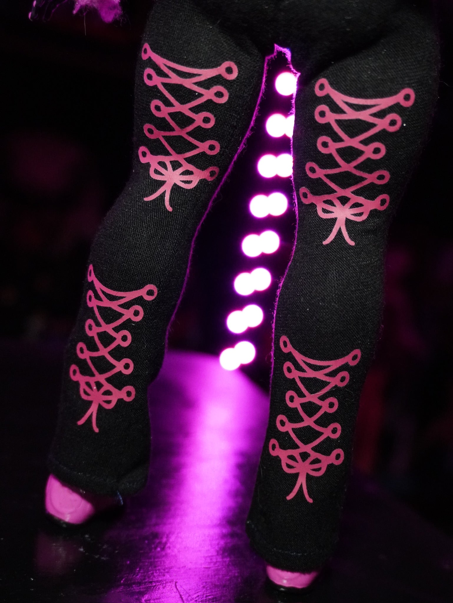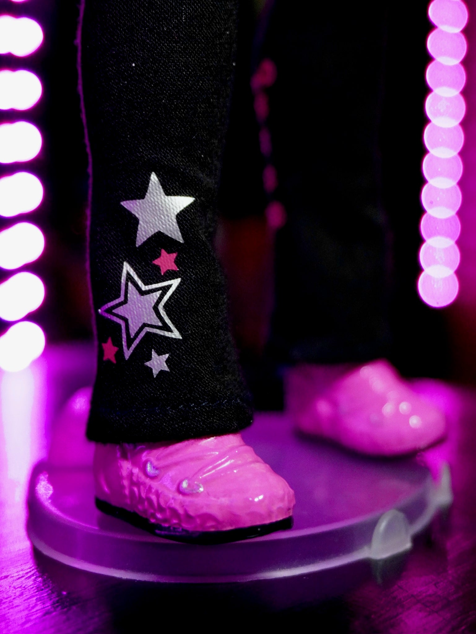 Features: catty logo tank, iridescent jacket, MB purse, custom fold over leggings (leggings have a tiny hole on one side but is not very noticeable), bedazzled glasses, moon boots .